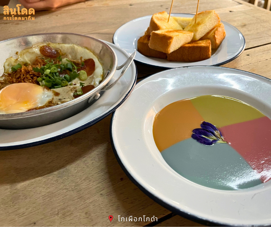 โกเผือกโกดำ ร้านอาหารเช้าสุดฮิต ที่นักท่องเที่ยวนิยมแวะเวียนเข้ามาลิ้มลอง โดยเมนูที่น่าสนใจคงจะหนีไม่พ้น ขนมปังปิ้ง จิ้มสังขยาสามสี ที่เป็นจุดขายของที่นี่ โดยจะมีสังขยาอัญชันที่ว้าวมากๆ และยังมีเมนูไข่กระทะ ที่เด็ดไม่แพ้กัน