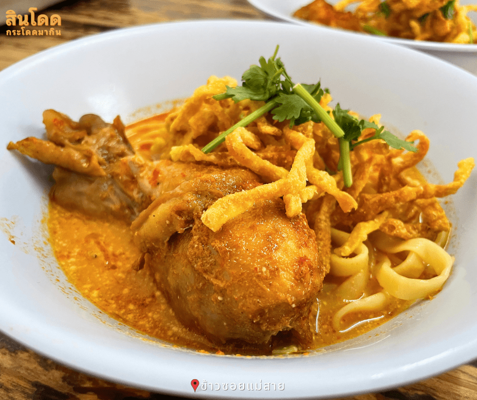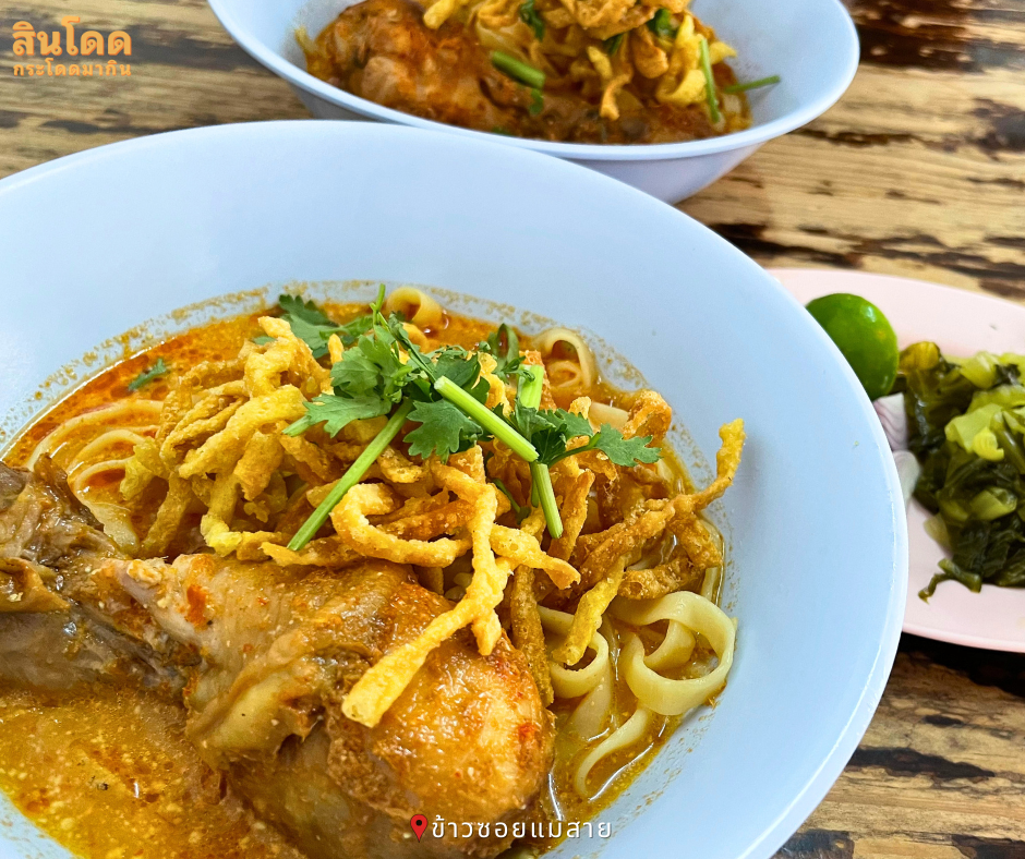 ข้าวซอยแม่สาย เป็นตำนานข้าวซอยดังที่ได้รางวัลมิชลิน ใครมาเชียงใหม่ต้องลอง เส้นข้าวซอยเหนียวนุ่มกำลังดี กินคู่กับเครื่องเคียงอย่างผักกาดดองและหอมแดง เข้ากันอย่างลงตัว บรรยากาศสไตล์บ้านๆ แต่รสชาติรับรองว่าไม่ธรรมดาแน่นอน